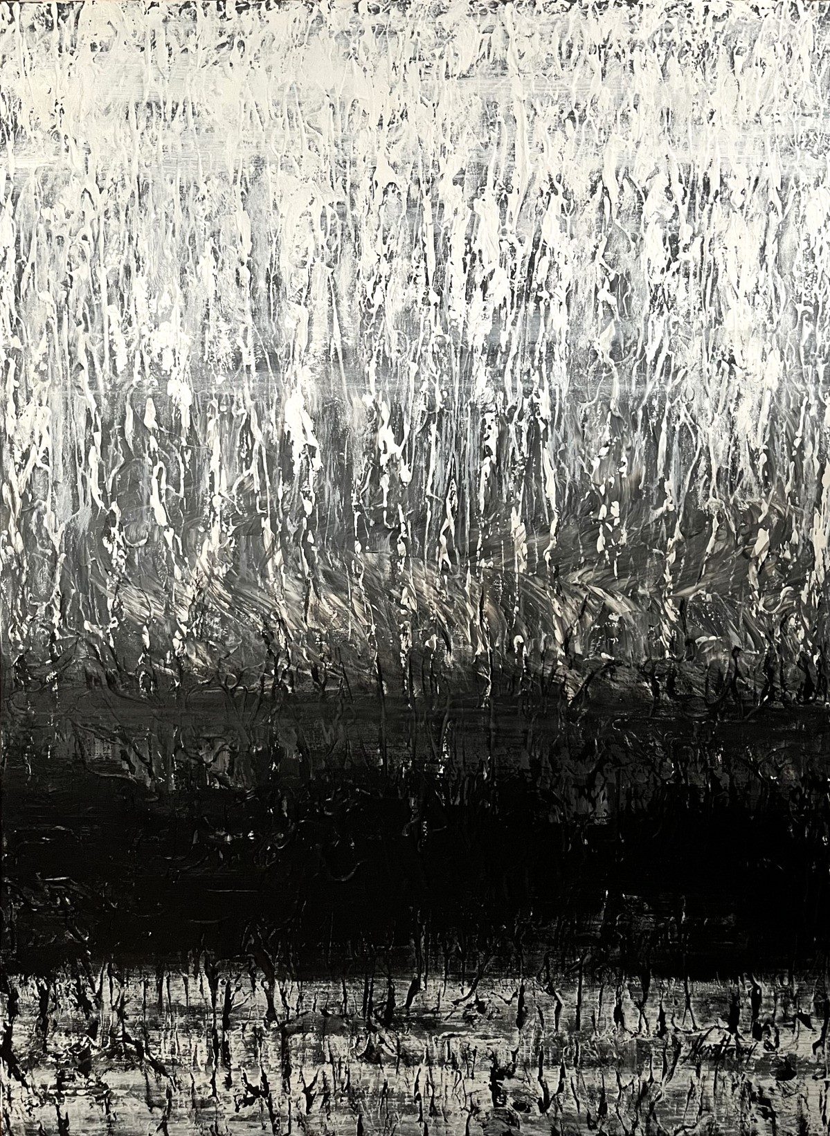 A grounding horizon anchors the composition. Below it, a deep dark field holds the weight of the piece, while soft white roots reach and settle, offering a sense of connection and stability. The surface is richly textured, built slowly through layered gestures, allowing the painting to feel alive—always moving, even in stillness.
