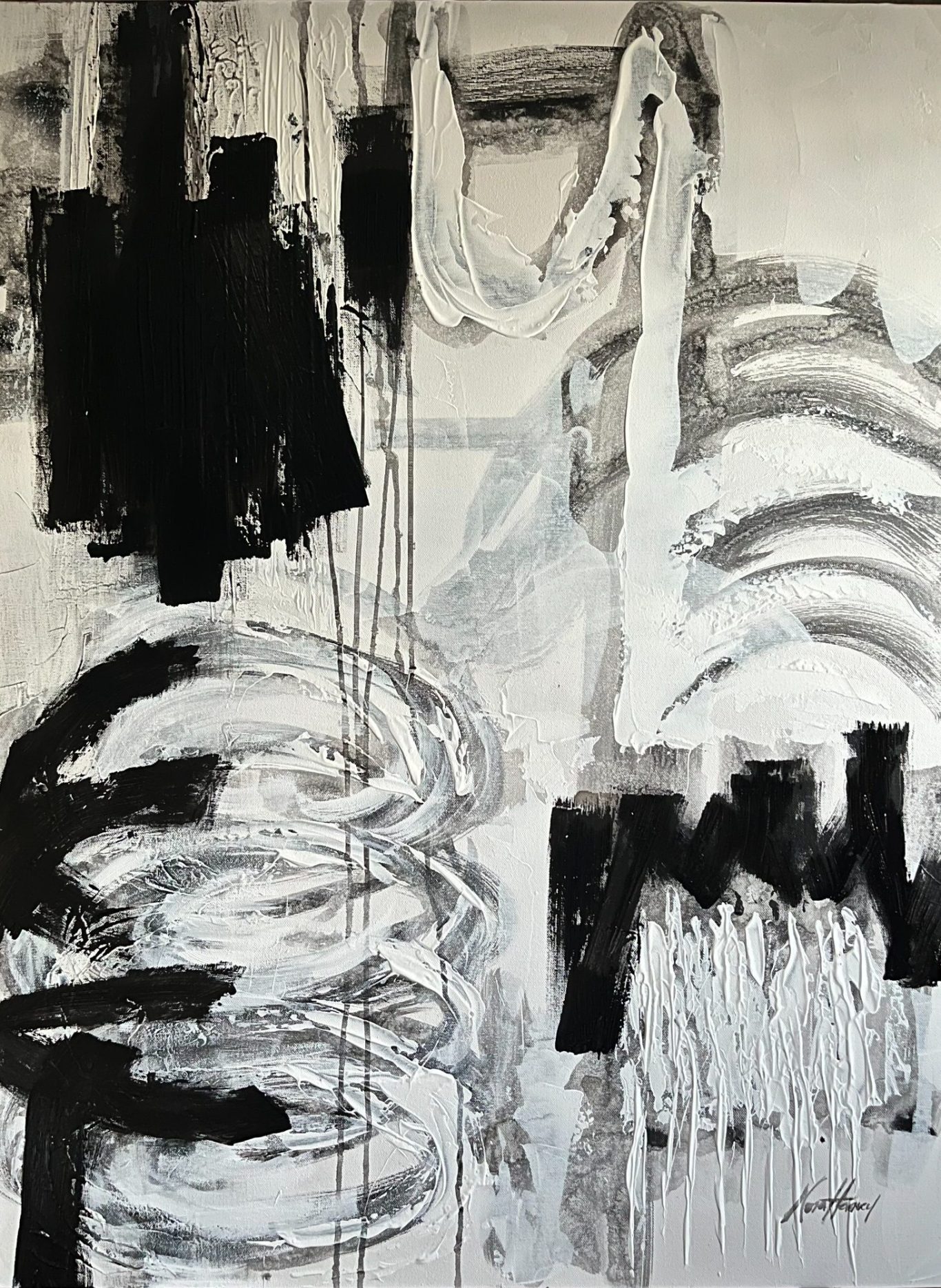 Life’s Intricate Dance explores the balance between stillness and movement that shapes everyday life. A bold black form anchors the composition, symbolizing calm and contemplation, while layered gestures in black, white, and grey create a sense of gentle motion and rhythm. Circular forms suggest the quiet busyness of life, bridge-like elements evoke transition and connection, and repeated white lines introduce order and continuity. Together, these elements form a reflective, meditative abstraction—an invitation to pause, observe, and find harmony within life’s ongoing flow.